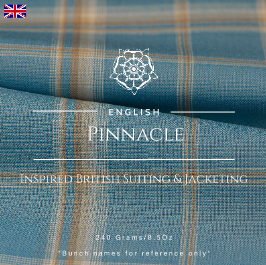 Woven in Huddersfield, England, Pinnacle is 240 gms / 8.5 oz Extrafine Pure new wool cloth cleverly embraces innovative finishing techniques to provide a superior drape, and exquisite touch. The perfect collection for your next sport jacket and plain trouser wardrobe look.
