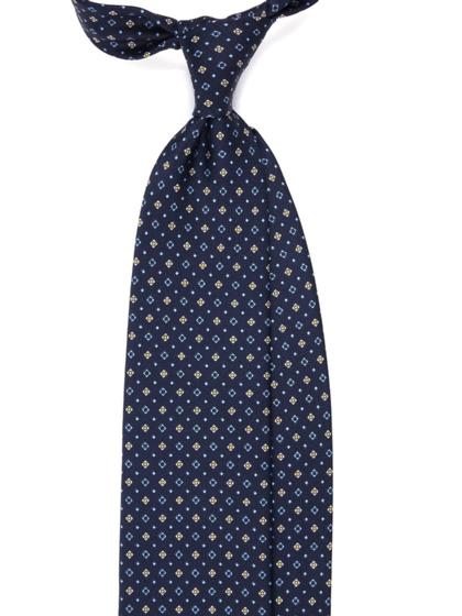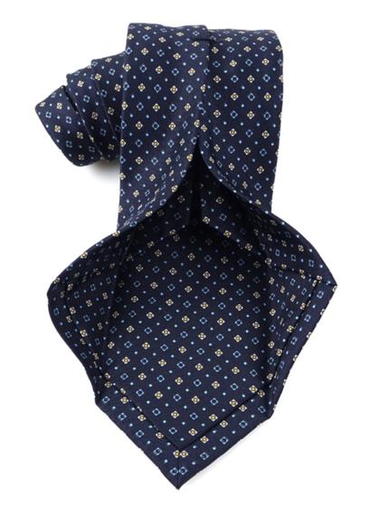 It is considered "the queen" among the ties. A 7-fold tie requires the use of twice the fabric, compared to a traditional 3-fold, and double the manual labor, skilled labor. The hold and the way of falling off a 7-fold are impeccable. Furthermore, this construction gives the tie a beautiful, intense, and light hand, impossible to obtain with less fabric. The difference between a 3-fold and a 7-fold tie can only be perceived by wearing it.