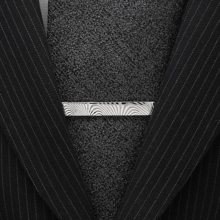 The imprint on this stainless-steel tie clip draws inspiration from traditional Damascus steel, creating a beautiful pattern as unique as its wearer. Featuring a hinged backing for ease of dressing, this elegant piece will immediately become your new favorite accessory. Includes individual gift box.
