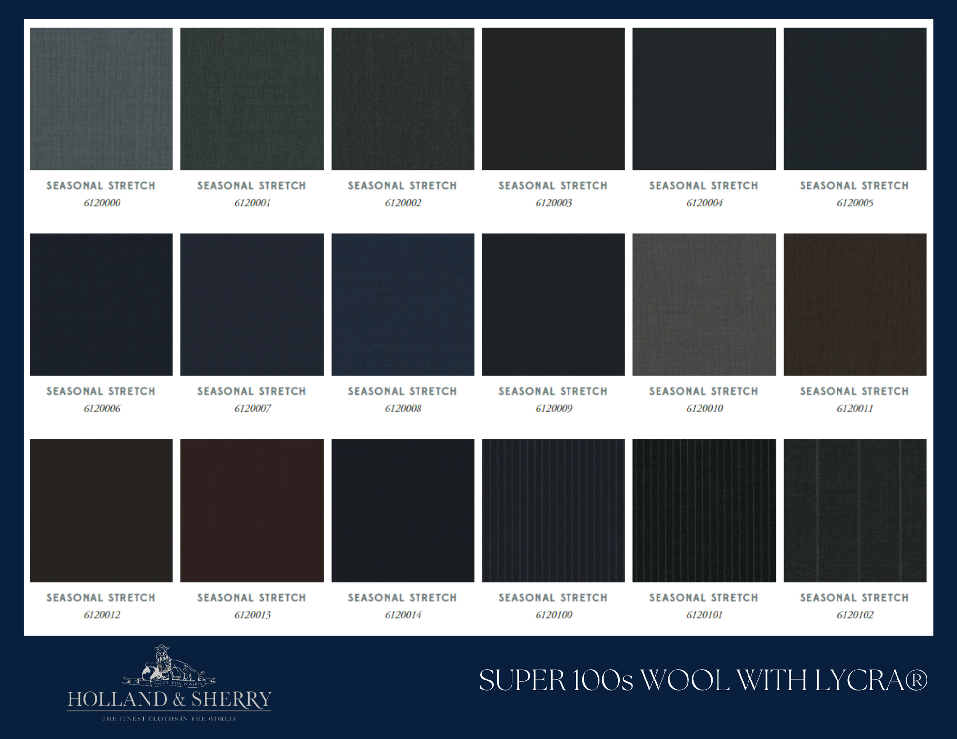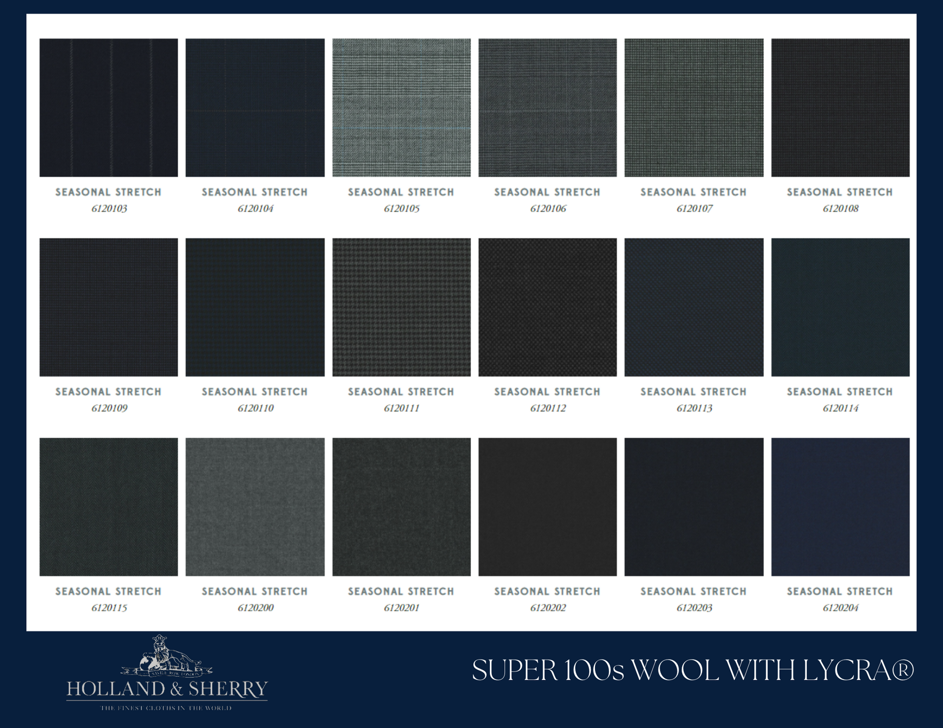 Thanks to the incredible success of our Sherry Stretch collection, we have decided to extend our offering of wool Lycra® blends. Comprising a series of solid plains in twill and prunelle constructions, in both clear-cut and flannel finishes in a comprehensive collection of stripes, small, neat designs and glen checks, this collection is sure to please all.