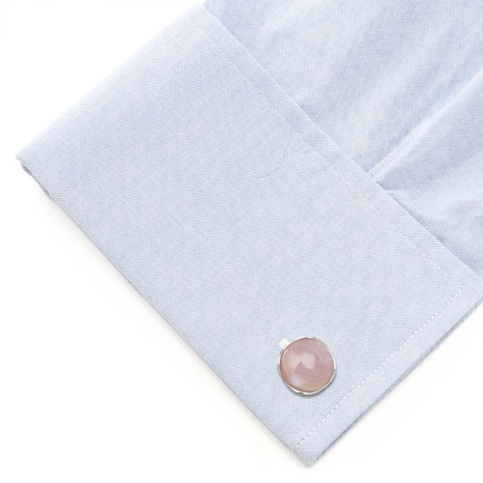 Beautiful creamy pink mother of pearl has been cut into a cushioned disc and surrounded in shiny sterling silver, to create this elegant set of cufflinks and tuxedo studs. Cufflinks feature round logo swivel closures for ease of dressing, and the studs have soft-edged fixed backings to keep them in place all night long. Perfect for any spring or summer formal occasions.