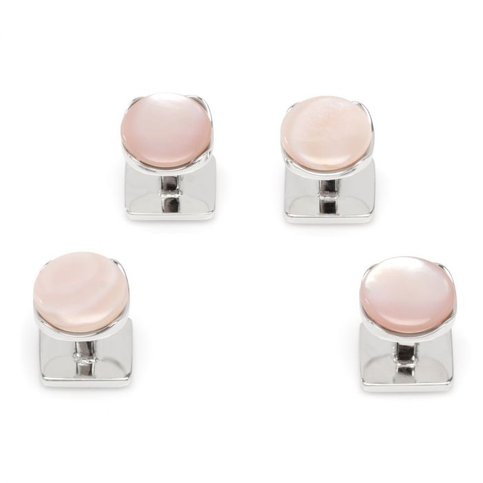 Beautiful creamy pink mother of pearl has been cut into a cushioned disc and surrounded in shiny sterling silver, to create this elegant set of tuxedo studs. Cufflinks feature round logo swivel closures for ease of dressing, and the studs have soft-edged fixed backings to keep them in place all night long. Perfect for any spring or summer formal occasions.