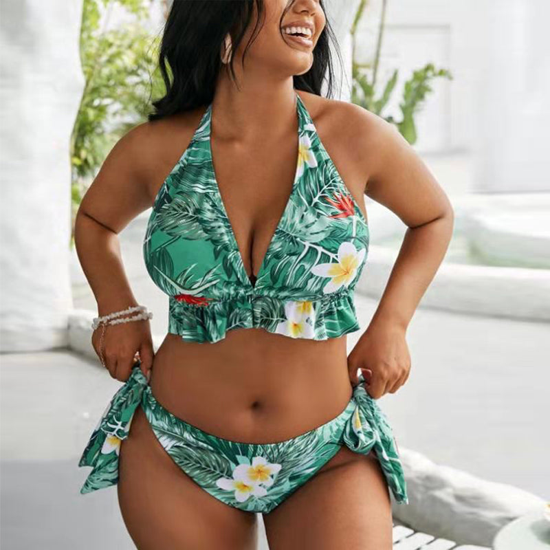 The Hip-Tie Floral Split Ruffle Halter Bikini