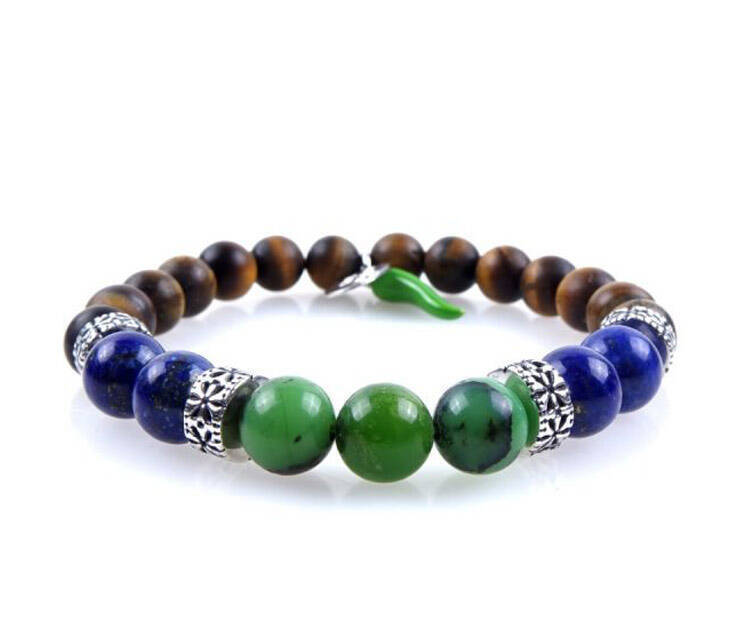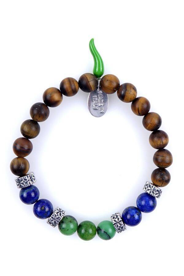 Elastic bracelet in natural stone TIGER'S EYE, LAPIS, CHRYSOPRASE and SILVER 925 - HORN Collection